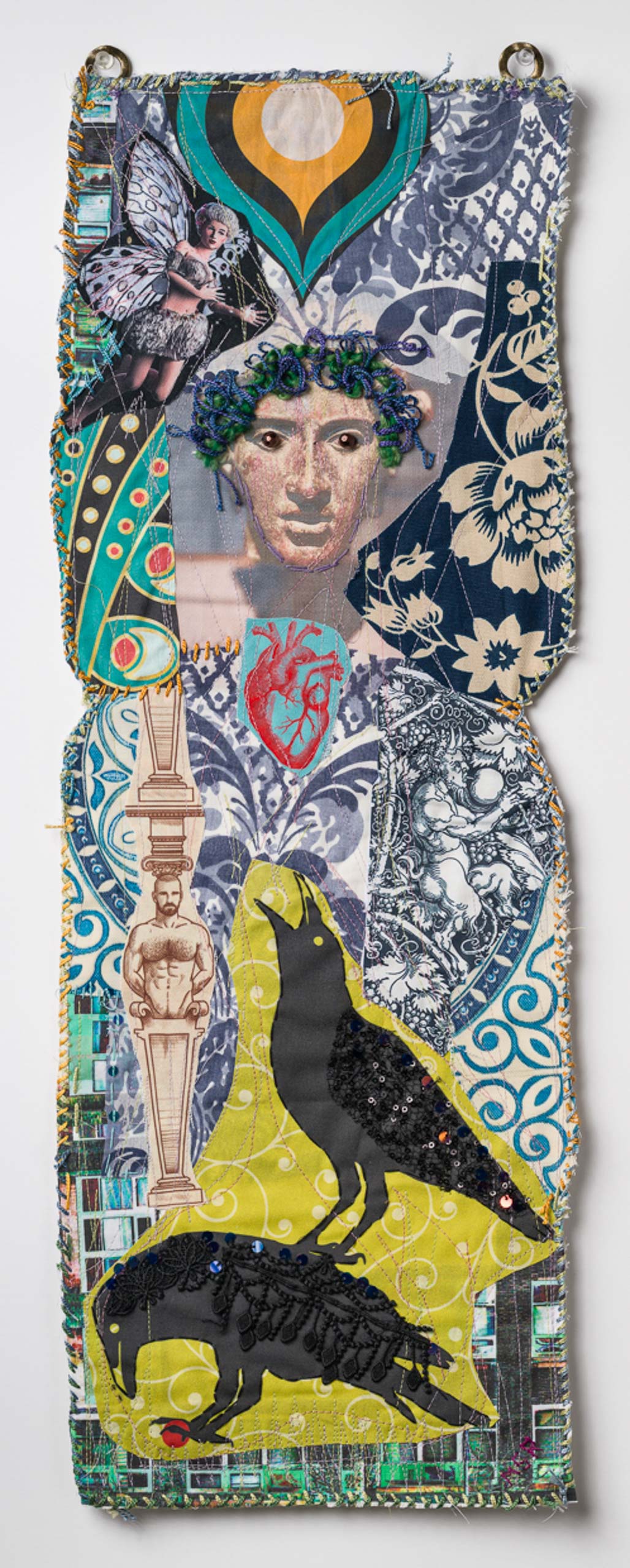Textile collage with machine and hand-stitching, embroidery, sequins, and beading on fabric