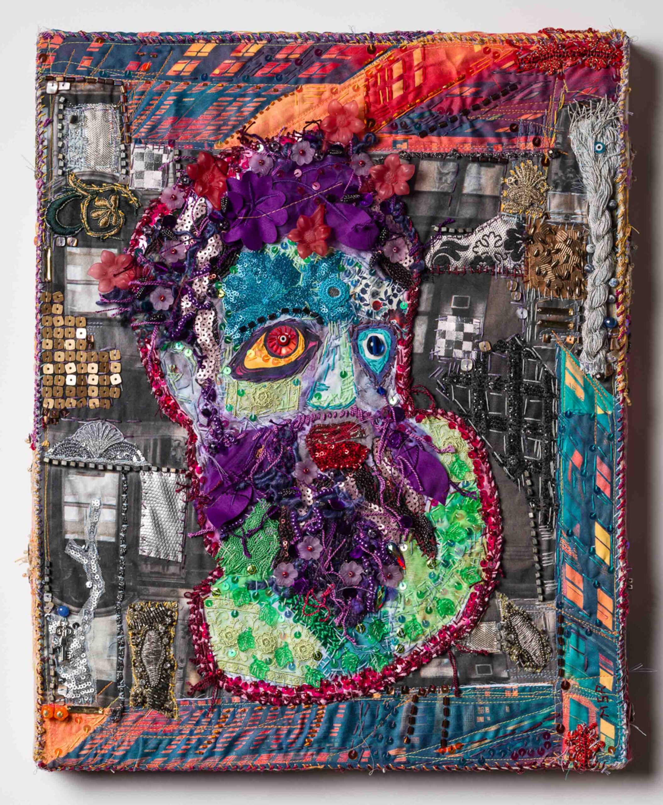 Textile collage with sequins, hand-beading, and embroidery on canvas